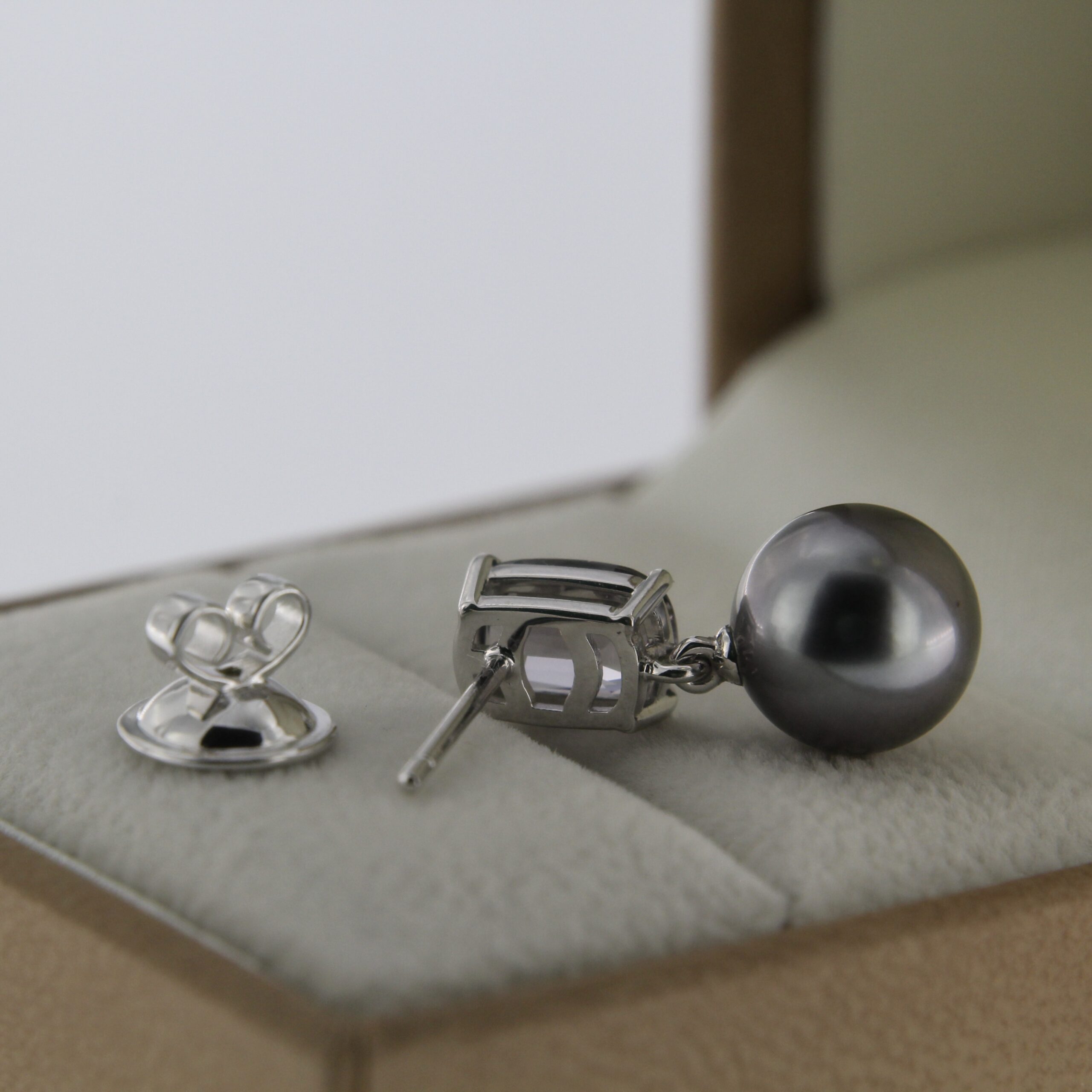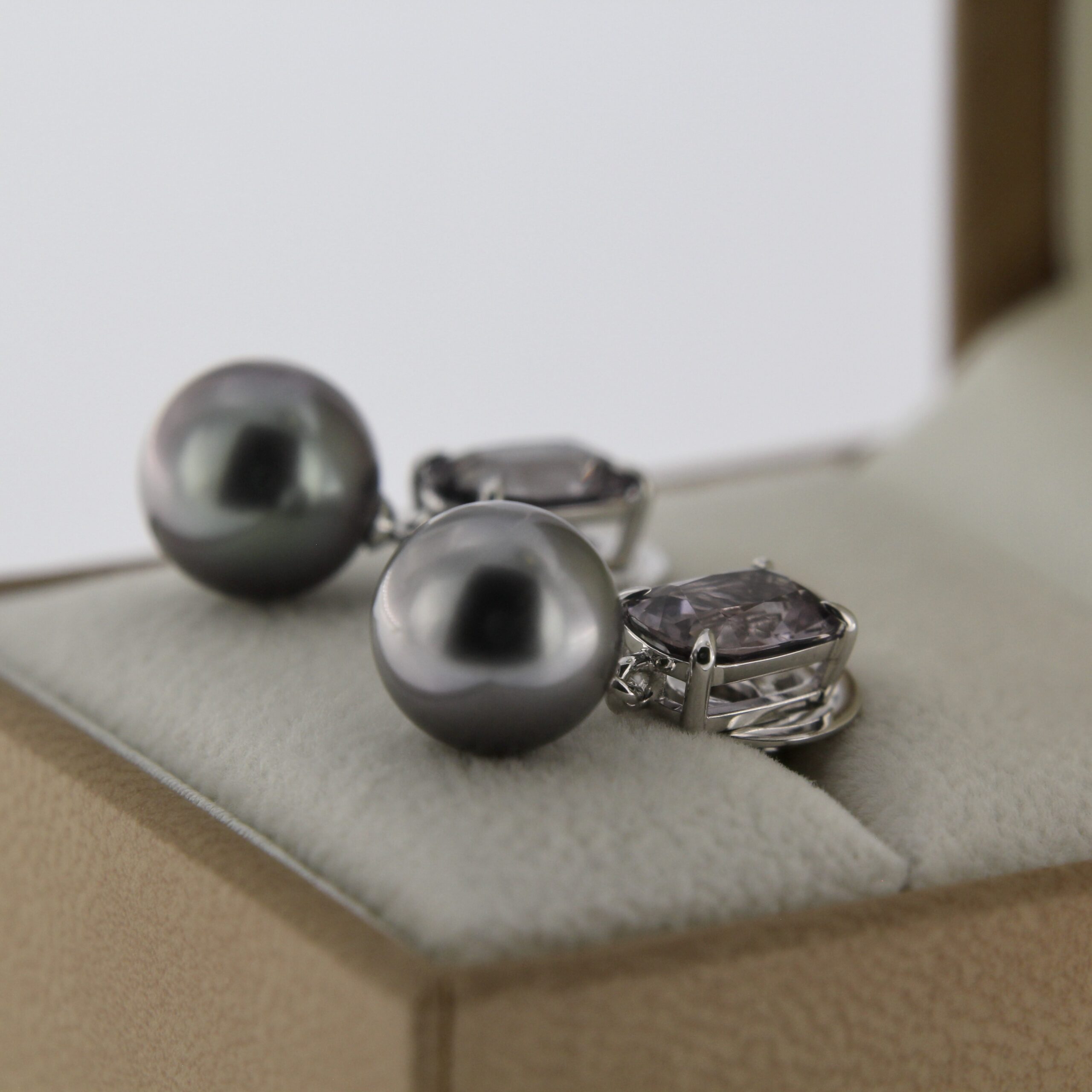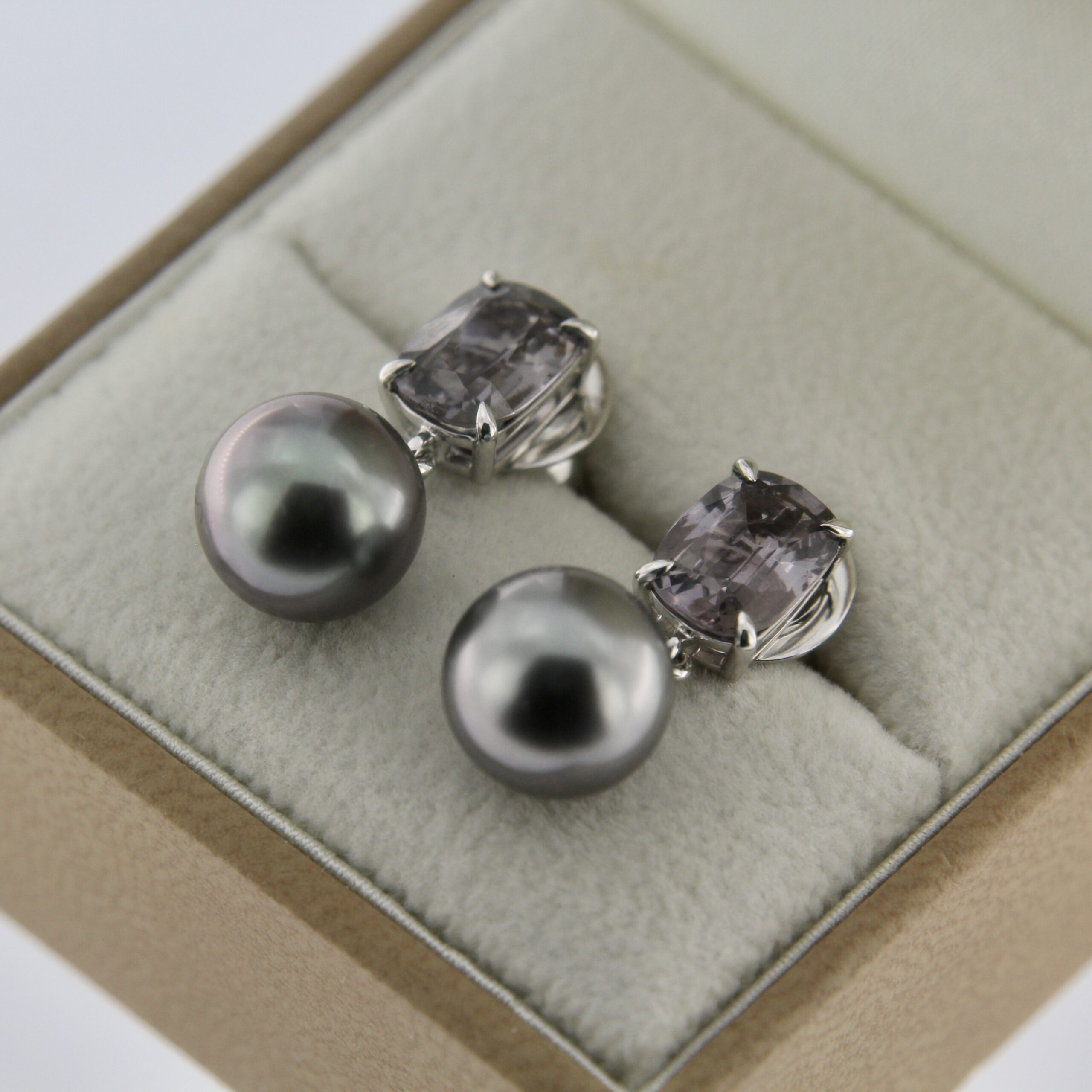 14K white gold Burma Spinel and Tahiti pearl earrings.