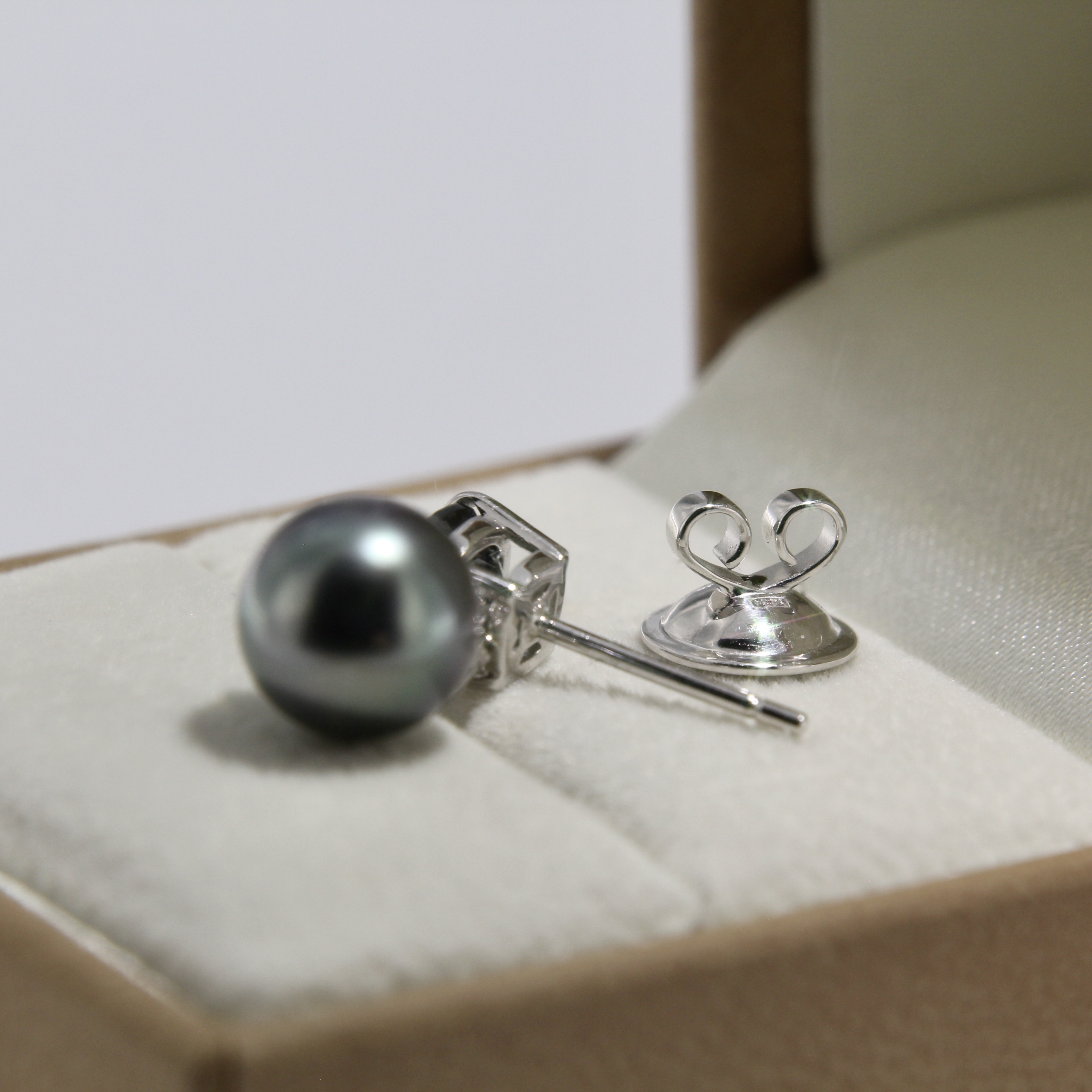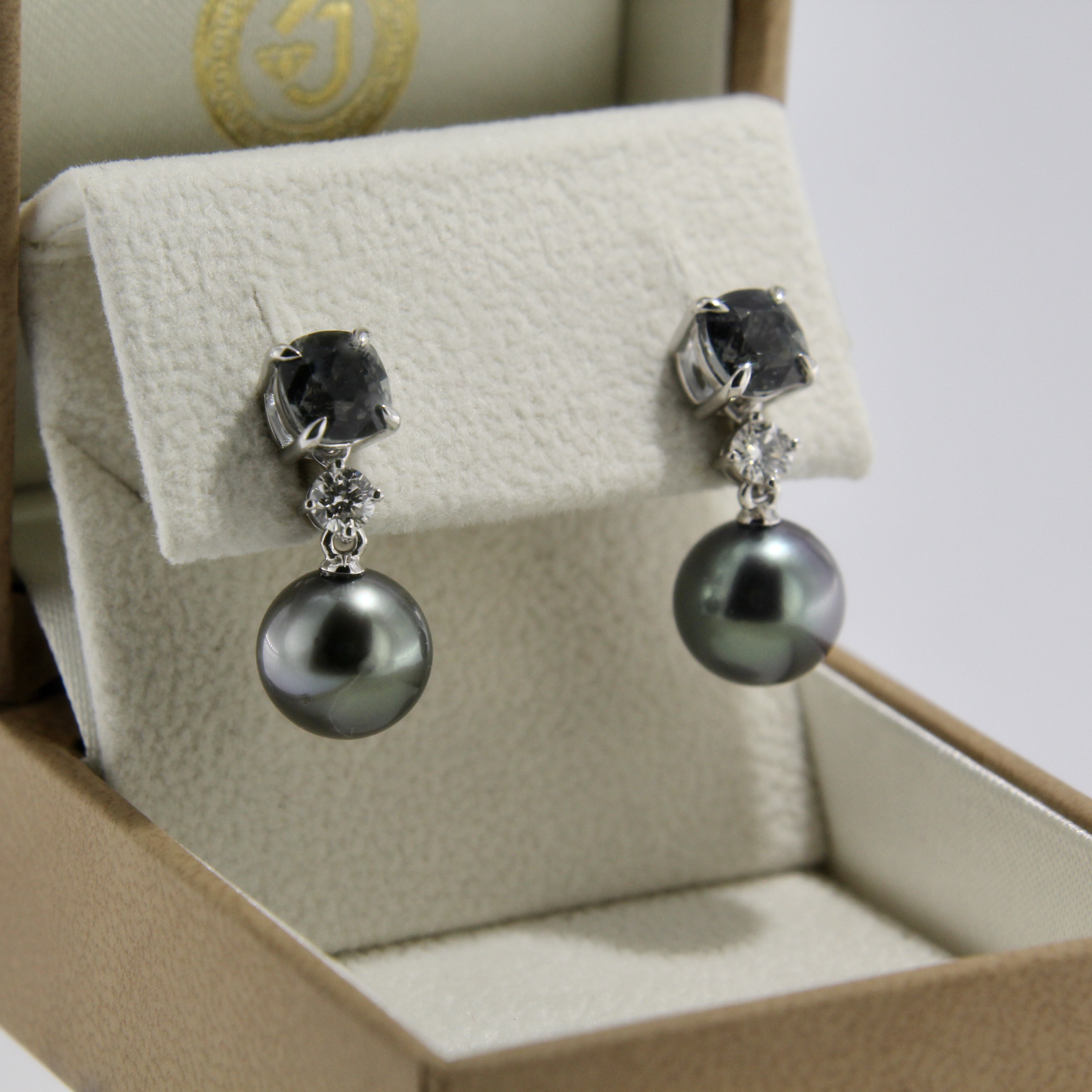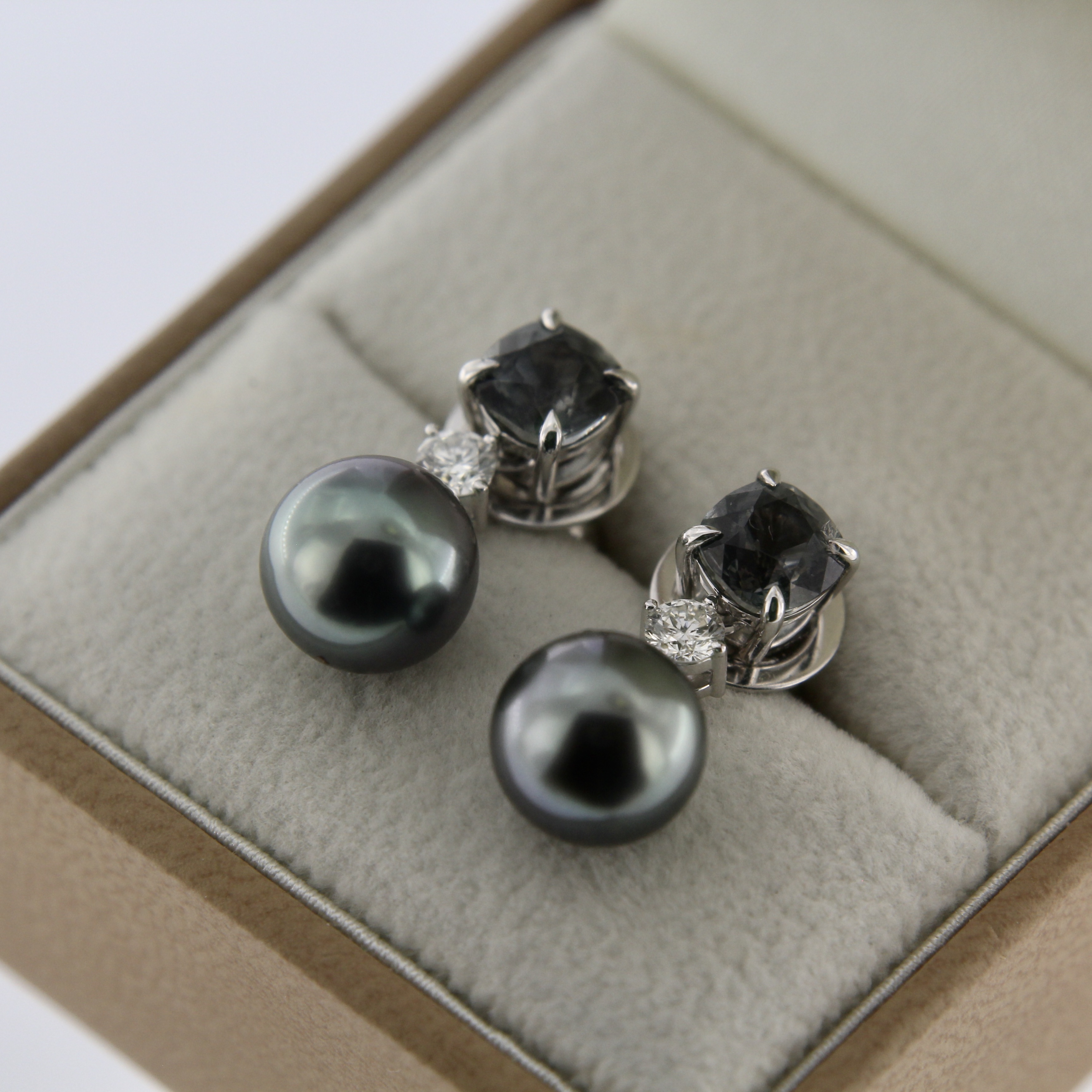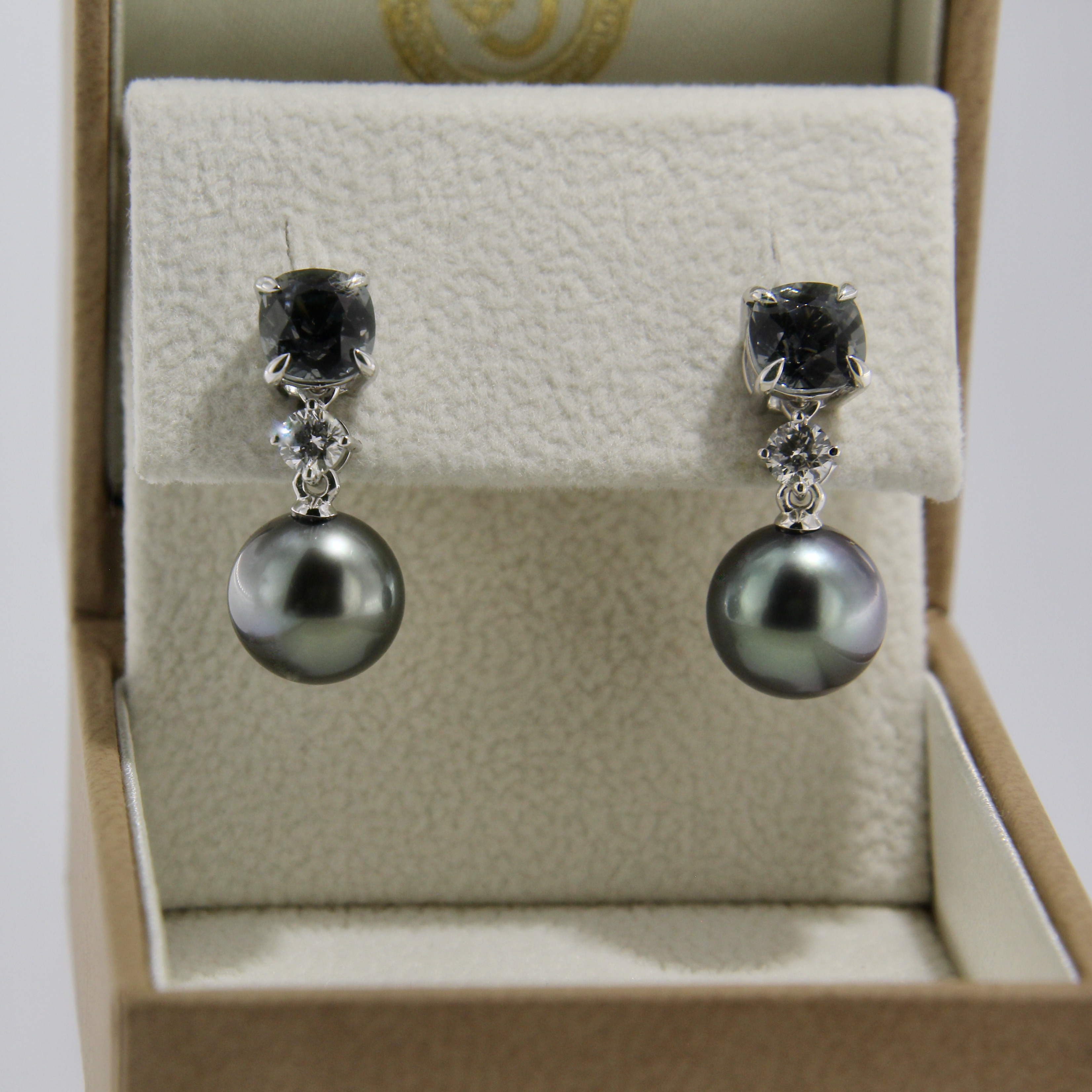 Cерьги с серой шпинелью и жемчугом Таити из белого золота 585 пробы с бриллиантами.