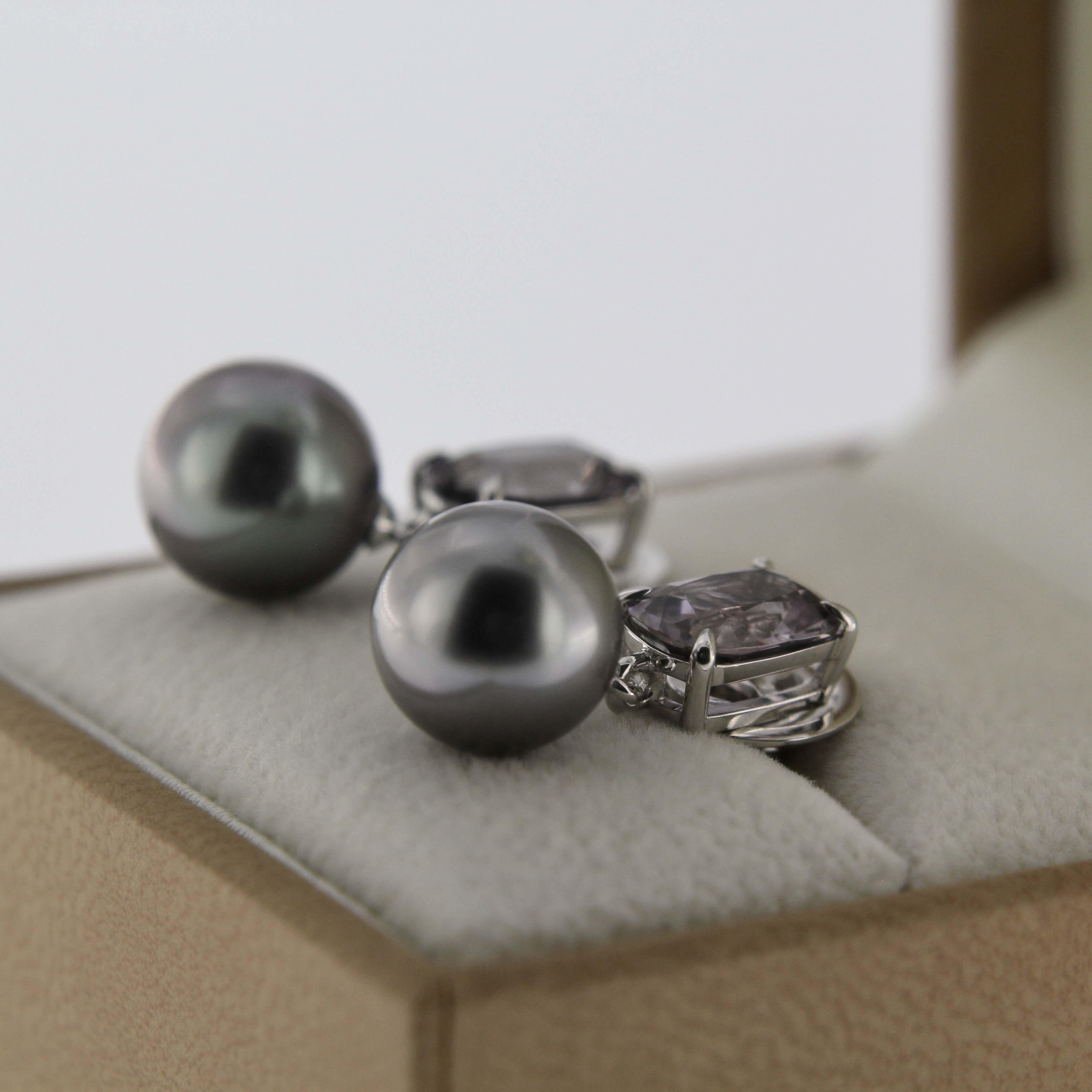 Cерьги с серо-фиолетовой шпинелью и жемчугом Таити из белого золота 585 пробы.